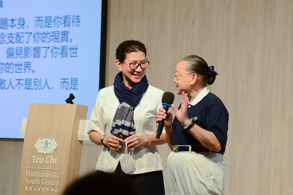 Cheah Lee Hwa invites a senior Tzu Chi volunteer (Sister Yi De) who has been caring for the Tzu Chi’s youth for more than ten years to come on stage and share her experience. Despite suffering from illnesses, she still persevered in accompanying and caring for the youths. (Photo by Tan Sam Ba)