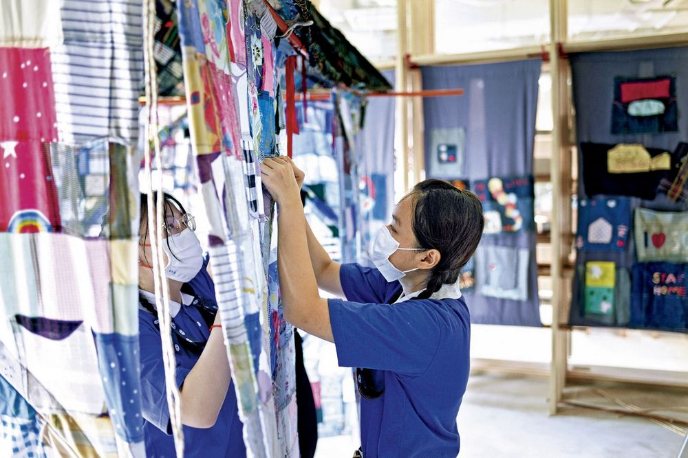 Nearby residents, migrant workers and volunteers came together to weave pieces of carpet and construct the Joglo House during the “Stay Home Quilt” art exhibition open house.