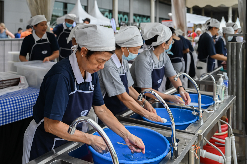 除了每年固定的回收区及环保倡导,这次还增设蔬食区、游戏教育区、慈悲科技展示区与人文推广区。现场最引人注目的,是分工清楚、整齐干净的洗碗区,若要做到全面绿化环保,美食区就绝对不能使用一次性餐具,洗碗区的志工将一个个餐具清洁后,再送回摊位使用。