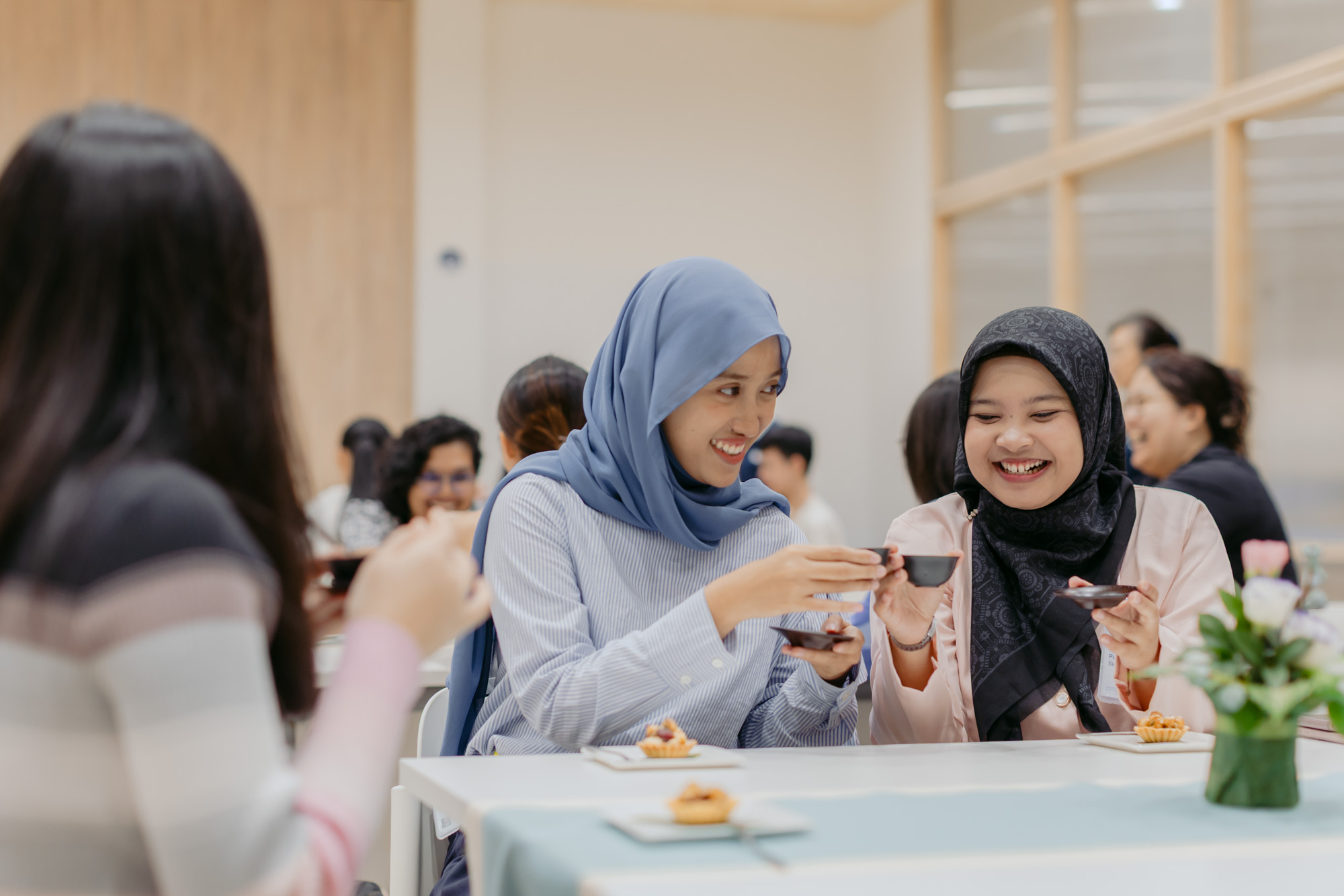 Natasya Pustika Siregar(右)与Bella Citra Hadini(左)报名参加茶道体验课程,借此机会了解中国茶文化。摄/陈正宇