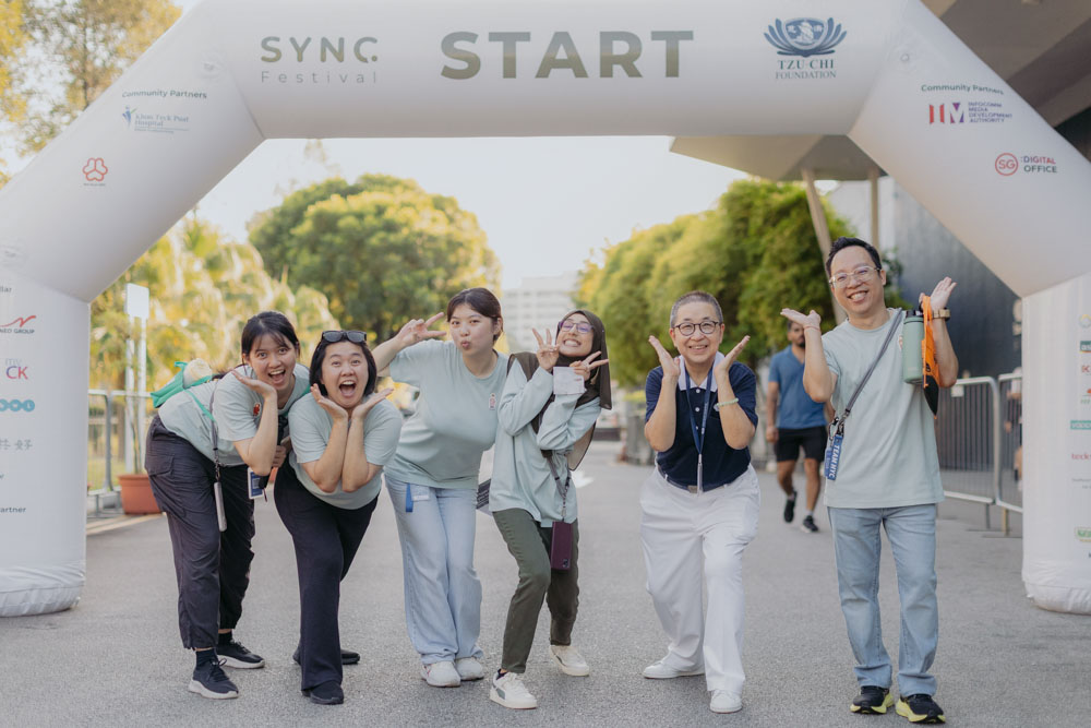 在慈济基金会(新加坡)举办的首届SYNC. Festival中,林伟庆与慈济人文青年中心的年轻同仁轻松合影。